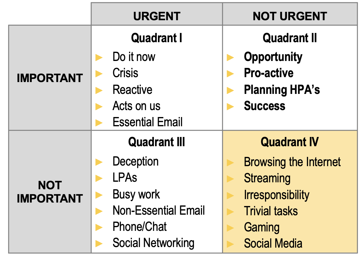 On the third day of an Academy Leadership Excellence Course (LEC), our first workshop focuses on Setting Leadership Priorities. One of the most interesting parts of the workshop is based on Steven Covey’s four time management quadrants: